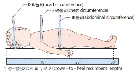 ④ 가슴둘레: 신생아에서만 측정. 머리둘레가 가슴둘레보다 더 큼, 줄자로 유두선을 지나 흉곽을 측정. 들숨과 날숨 사이에 시행함