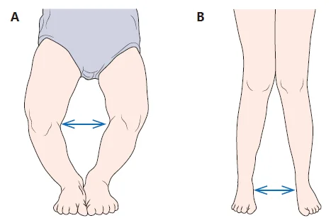 ③ 가쪽휜무릎은 양 무릎을 함께 모았을 때 무릎은 가까이 붙는데 발목이 2.5 cm 이상 떨어진 경우. X형 다리. 생후 2∼8세까지 정상임