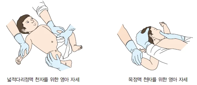 ⑤ 목정맥·넓적다리정맥 천자 후 출혈이 멈출 때까지 3∼5분 천자 부위를 압박함