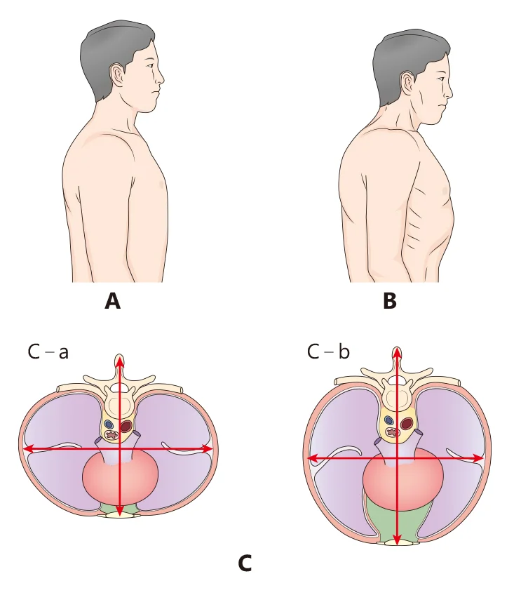 C. 정상 흉곽(C–a)과 술통 모양 흉곽(C–b)의 횡단면 비교