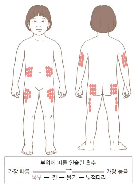 • 인슐린 주사 부위는 상박, 복부, 넓적다리, 볼기