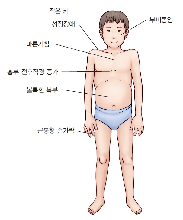 ① 호흡기계: 천명음, 건조하고 마른기침, 폐렴, 기관지염, 곤봉형 손가락, 원통형 흉곽 등