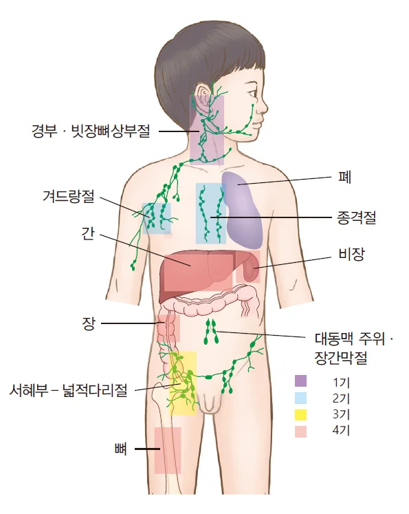 ② 증상: 통증 없이 단단한 움직이는 선증. 림프절의 무통성 증대 90%, 종격동 폐쇄, 발열, 야간 발한
