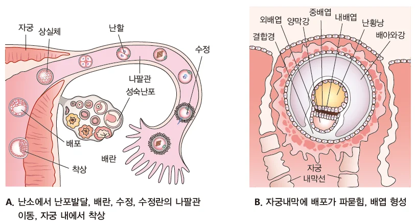 수정란은 수정된 후 즉시 나팔관을 지나 자궁으로 옮겨가는 동안 접합자, 상실체, 배포기의 세포분열과정을 거침(3∼4일)