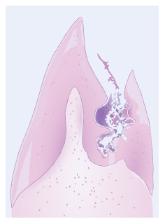 ⑦ 후구치: 두 번째로 호발하는 것, 상악 제3대구치 원심에 위치