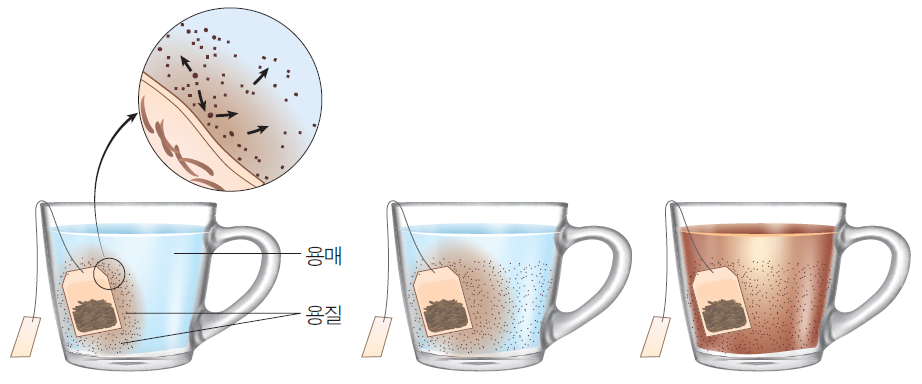 ① 확산: 농도가 높은 곳에서 낮은 곳으로 물질의 자발적 이동