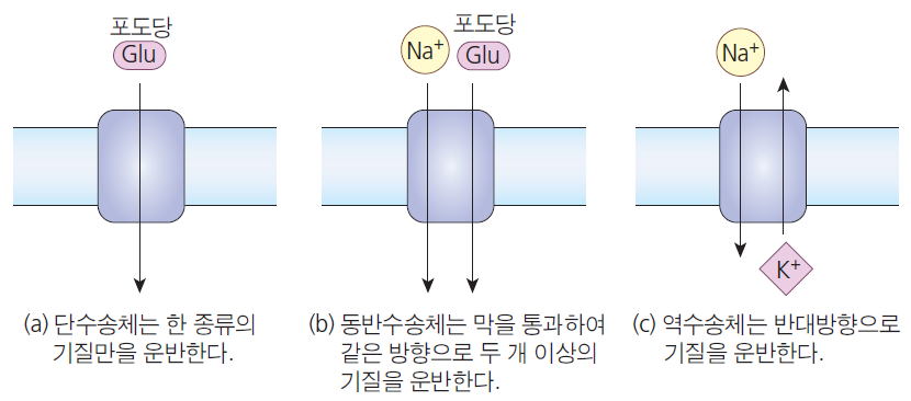 능동수송 | Na+–K+ pump | 농도경사에 역행하여 물질이동, 운반단백질과 에너지 필요(ATP) | 동물세포의 세포막 (세뇨관: 재흡수) |