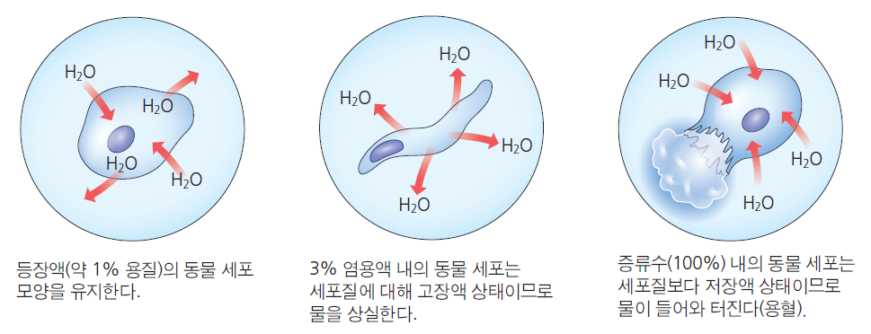 ③ 삼투: 용질의 농도가 낮은 곳에서 높은 곳으로 물(용매)이 확산 이동하는 것(생체막을 통과하는 물의 단순 확산)