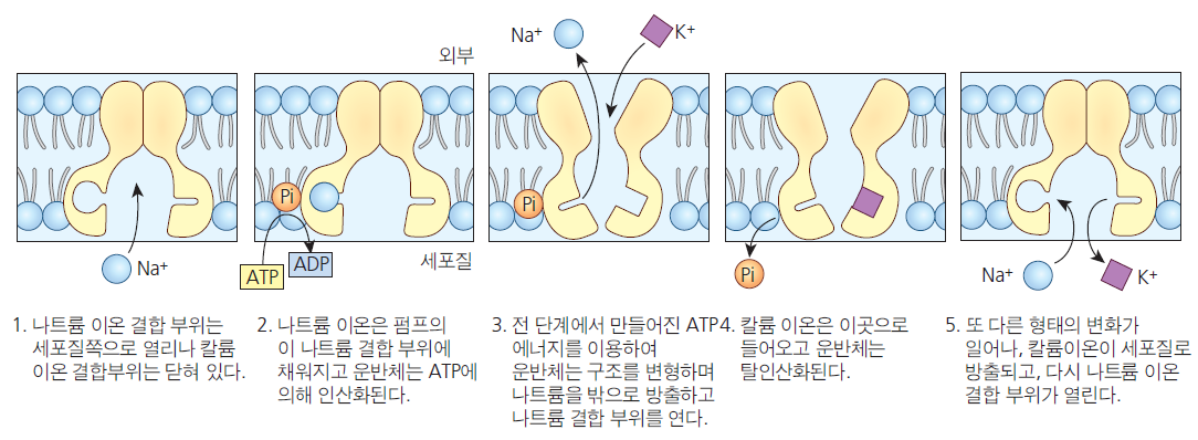 ② 대부분의 동물세포의 세포막에 존재 → 나트륨–칼륨 펌프(Na+-K+ pump)