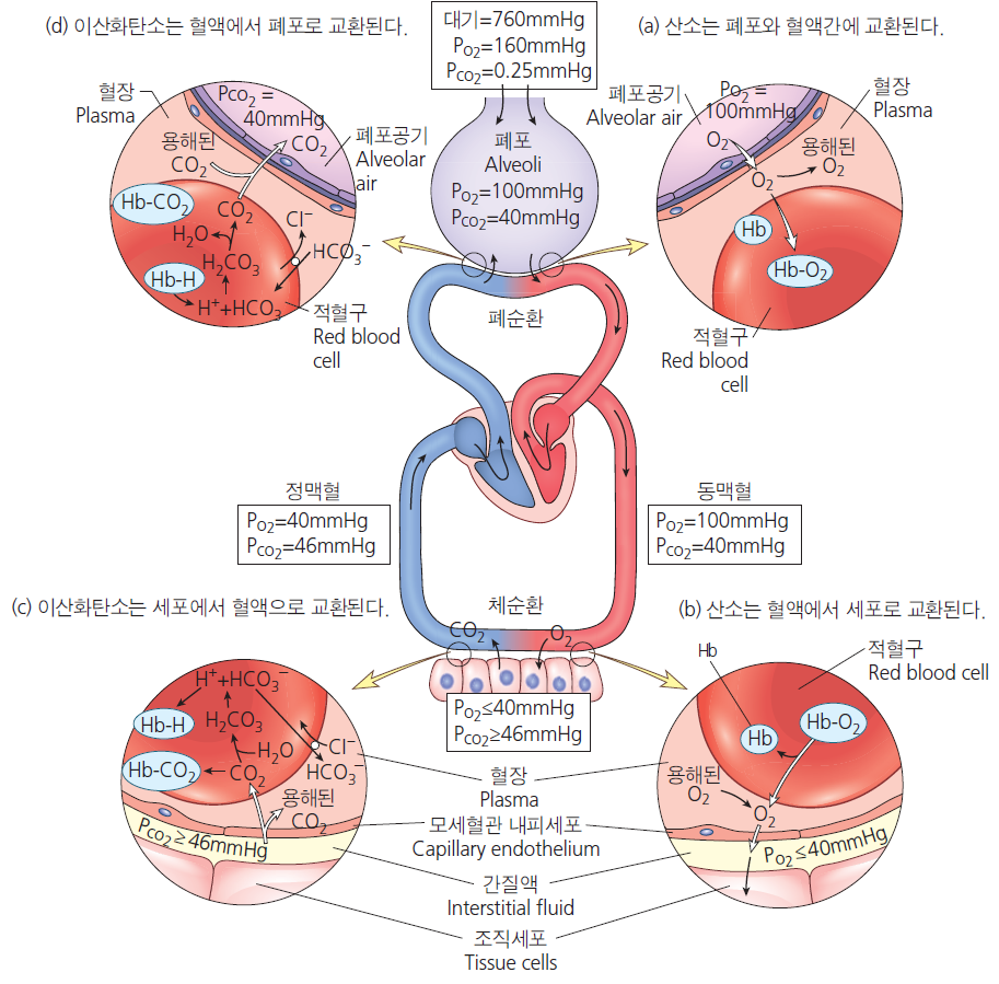 → 정맥혈액[O2(PO2: 40 mmHg), CO2(PCO2: 46 mmHg)]은 폐포로 들어감(폐포와 혈액 사이의 가스교한)