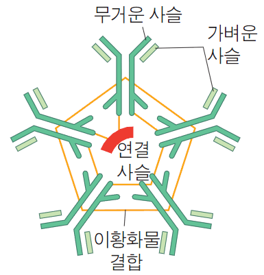 | •항원 노출 후 가장 먼저 생성되는 항체이다. •전체 항체의 6%를 차지한다. •중화반응, 보체활성화(고전경로)를 유도한다. •B세포의 막에 존재하는 IgM은 B세포의 항원수용체이다. |